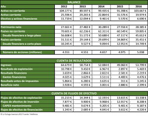 Sobre la situación financiera es delicada, pero no lo veo tan mal como comentas porque este ejercicio se ha hecho una reestructuración importante, no solo en trabajadores, sino en directivas que han sido cesadas y muchas regionales directamente eliminadas. Están subiendo precios, como la competencia, y creo que están mejorando en atención al cliente. Esto hace que de cara a 2.017 haya muchos menos gastos y seguramente más ventas porque varios mercados importantes se están recuperando. Por otro lado, tenemos que tener en cuenta que cada vez que Telefónica tiene un vencimiento de deuda lo renueva en mejores condiciones, por lo que los gastos financieros se reducen debiendo lo mismo. Con todo, la deuda es muy alta y jamás se debió llegar a ello, pero esto es algo que en España no se entiende, en general usamos demasiada deuda y pagamos demasiados dividendos.